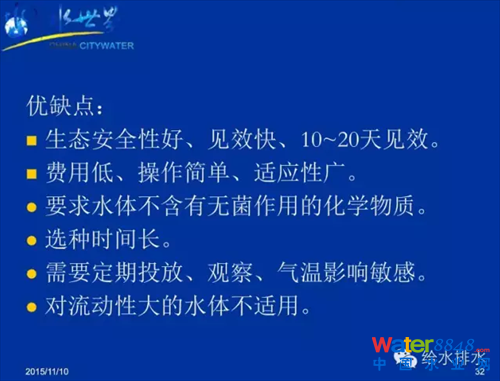 這種方法的優(yōu)點是生態(tài)安全性好、見效快(10~20天見效),費用低、操作簡單、適應性廣;缺點是,要求水體不含有滅菌作用的化學物質,選種時間長,需要定期投放、觀察、氣溫影響敏感,對流動性大的水體不適用。