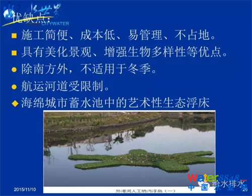 該方法施工簡便、成本低、易管理、不占地。具有美化景觀、增強生物多樣性等優(yōu)點。缺點是,除南方外,不適用于冬季。且航運河道受限制。