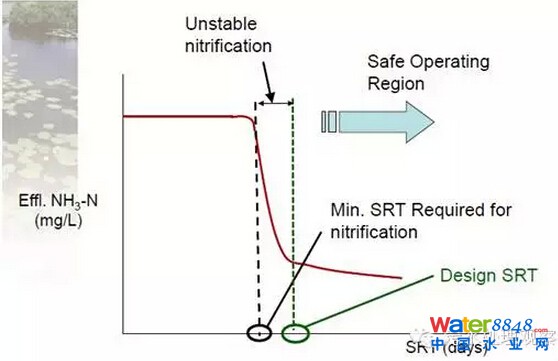 這個(gè)圖中縱坐標(biāo)是出水氨氮,橫坐標(biāo)是泥齡,在非穩(wěn)定的硝化階段,泥齡是一個(gè)很狹窄的區(qū)域,在這個(gè)區(qū)域內(nèi)氨氮要么高、要么低,變化的范圍很大,而在完全沒(méi)有硝化或者是充分穩(wěn)定的硝化階段,出水的氨氮都是非常穩(wěn)定的。