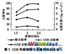 圖3描述了停留時間對COD和酚降解的影響情況,可知,在一定范圍內(nèi),停留時間對COD和酚的去除率影響不大,均有較好的出水水質(zhì)和較高的去除率;進(jìn)一步發(fā)現(xiàn),當(dāng)停留時間從2.5h減小到2.0h后,COD的平均去除率雖由76.0%降到73.6%,但它的去除負(fù)荷卻由3.22kg/(m.d) 升高到4.49kg/(m·d);酚的平均去除率雖由95.5%降到93.8%,但它的去除負(fù)荷卻由1.08 kg/(m3.d) 升高到1.39kg/(m3·d);但是,如果停留時間再進(jìn)一步減小到1.5h,則降解效果明顯下降。本實(shí)驗(yàn)的目的在于尋求一種高效的含酚廢水的處理方式及較適宜的水力停留時間,使大部分的COD尤其酚得到降解,防止這些污染物在后續(xù)的綜合生化處理中產(chǎn)生沖擊,顯然,當(dāng)水力停留時間為2.0h時,就已經(jīng)達(dá)到了目的:出水中酚的平均質(zhì)量濃度為8.5 mg/L,平均去降率達(dá)到93%,而且此時COD和酚的去除負(fù)荷相對也大。