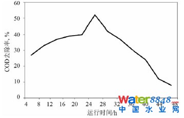 從上圖看,COD 的去除率在反沖洗后初期有明顯的上升趨勢,主要是因?yàn)榉礇_洗后微生物處于內(nèi)源呼吸狀態(tài),其活性逐漸恢復(fù); 當(dāng)濾池運(yùn)行到中期(24 h) 時,COD 有較高的去除率; 但運(yùn)行到后期(48 h) 時,因截留的懸浮物和脫落的生物膜堵塞濾床而不利于溶解氧的傳輸,導(dǎo)致異養(yǎng)菌活性下降,去除效率下降。