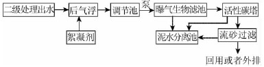 某石化污水處理場二級處理出水先經(jīng)過后氣浮進(jìn)一步去除石油類和COD,經(jīng)過調(diào)節(jié)池提升至曝氣生物濾池(簡稱BAF) 去除部分氨氮和COD,再通過活性碳塔過濾,進(jìn)入流砂過濾裝置去除懸浮物,從而完成污水深度處理流程。工藝流程圖如下: