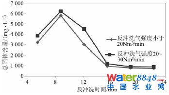 根據(jù)有關(guān)資料,氣反沖效率的影響明顯大于水沖強(qiáng)度變化的影響。因此,這里只考查了氣沖強(qiáng)度變化對反沖洗的影響。首先固定水沖強(qiáng)度,對比反沖洗氣強(qiáng)度在20 ~ 40 m3 /min 的氣沖效率,通過分析反沖洗液中的總固體含量來選擇控制范圍。