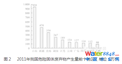 雖然近年我國經(jīng)濟(jì)高速發(fā)展,人們的生活水平也得到了明顯的提升,但是由于我國粗放型的經(jīng)濟(jì)發(fā)展方式,在經(jīng)濟(jì)發(fā)展的同時(shí)對環(huán)境造成了不可避免的危害,并且我國公民的環(huán)保意識較為薄弱,政府環(huán)保部門的政策、法律法規(guī)等也不夠完善,F(xiàn)如今,由環(huán)境污染引發(fā)的一些社會現(xiàn)象(如霧霾、水污染等)已經(jīng)給大家的生活、工作帶來了嚴(yán)重影響,對身體健康的危害不容忽視,我國的固體廢棄物處理處置的相關(guān)工作發(fā)展較慢,且處理技術(shù)和設(shè)備也比較落后。但近些年來由于我國對環(huán)保問題越來越重視,國家的投資力度也很大,法律法規(guī)也在逐步完善中。2011年我國危廢的年產(chǎn)量達(dá)到了3431 萬t 。圖2 是2011 年我國危險(xiǎn)固體廢棄物產(chǎn)量前十大地區(qū),從圖中可見山東、新疆、青海年產(chǎn)危廢量較多,占我國危廢總年產(chǎn)量的50% 以上,前十個地區(qū)危廢年產(chǎn)量占全國總排放量的80% 左右,相對比較集中,并且據(jù)統(tǒng)計(jì)每年我國危廢的產(chǎn)生量呈上升的趨勢。目前我國山東和廣州等地對危廢的處置能力較強(qiáng),新疆主要采取貯存的方式。