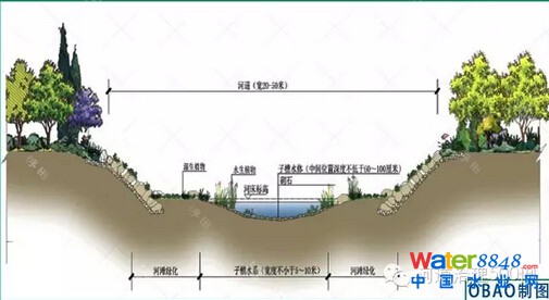 形成較為連續(xù)和穩(wěn)定的水系空間是川北河生態(tài)系統(tǒng)恢復(fù)的重要基礎(chǔ),因此對貧乏的水資源要高效利用。具體來說是在滿足生態(tài)功能需要的前提下,將水體空間塑造成狹長的子槽水系,減少水系面積,以減少河水的蒸發(fā)量與滲漏量,節(jié)約水資源。設(shè)計方法是在河床中間位置疏挖子槽,形成具有一定深度和寬度的過水斷面。