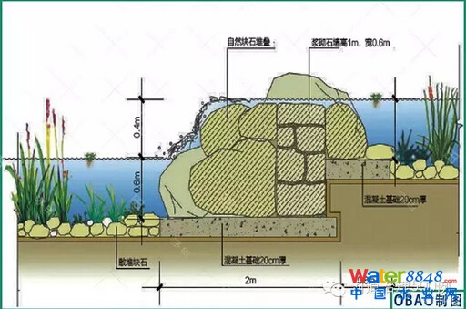 為形成較大水面,通過開挖河道與砌筑蓄水壩來攔蓄雨洪及涵養(yǎng)水源。蓄水壩高度約1m,壩體駝峰型,結(jié)構(gòu)上采用不透水漿砌石墻和河石堆坡,由木樁固定散堆河石。為不影響川北河防洪斷面,蓄水壩不高于河底設(shè)計高程。
