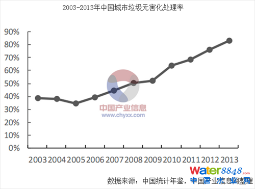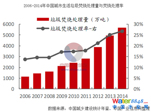 截止2014年,城鎮(zhèn)生活垃圾無害化處理廠已達(dá)到1947座,生活垃圾無害化處理能力達(dá)70.2萬噸/日,焚燒無害化處理能力20.1萬噸/日,占比28.6%,生活垃圾無害化處理量21160萬噸,其中焚燒的無害化處理量為5674萬噸,占比26.8%,與2010年相比焚燒無害化處理能力及處理量分別增長(zhǎng)9.8%,20.1%。
