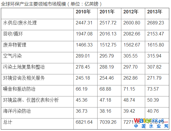 水供應(yīng)/廢水處理、回收/循環(huán)和廢棄物管理市場規(guī)模不斷擴(kuò)大。2013年全球環(huán)保產(chǎn)業(yè)中水供應(yīng)/廢水處理領(lǐng)域市場規(guī)模最大,達(dá)到2689.23億英鎊;其次是回收/循環(huán)領(lǐng)域,市場規(guī)模達(dá)到2153.47億英鎊;廢物管理領(lǐng)域的市場規(guī)模位居第三位,達(dá)到1615.80億英鎊。