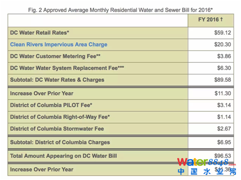根據(jù)美國新財年的收費標(biāo)準(zhǔn),自來水每噸約1.2美元,污水處理費每噸2美元,此外還收取不透水面積費和雨水費,不透水面積費的收取標(biāo)準(zhǔn)為每個居住單元當(dāng)量(92平米不透水面積)每月收取20.30美元,雨水費收取標(biāo)準(zhǔn)為每個居住單元當(dāng)量(92平米不透水面積)每月收取2.67美元。根據(jù)這個收費辦法,華盛頓特區(qū)的居民,平均每月需要繳納的雨水費、污水費、供水費等總計96.53美元,比上一財年增長11.36美元。