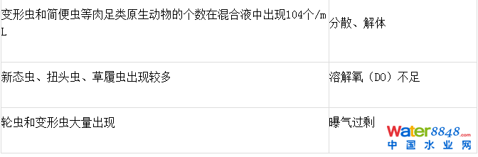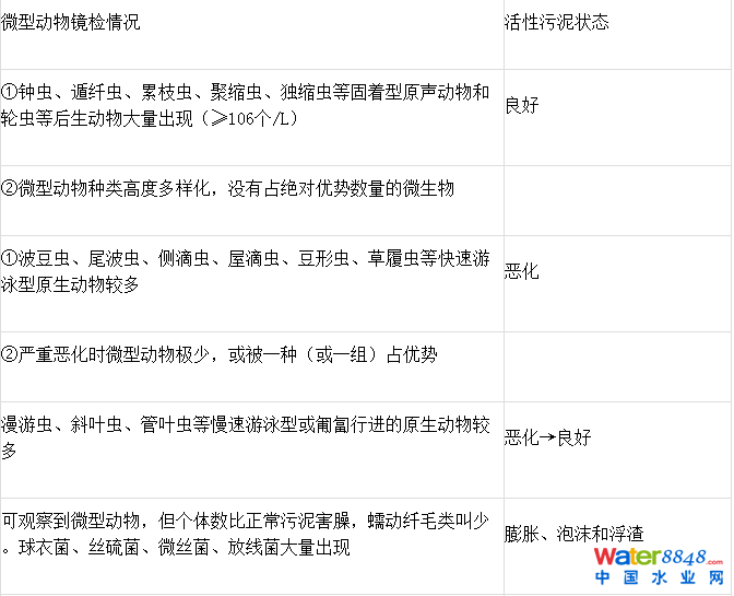 用顯微鏡對活性污泥中的微生物進(jìn)行鏡檢,其中的原生動物和后生動物(統(tǒng)稱為微型動物)相對比細(xì)菌個體大,在顯微鏡下易于觀察、鑒別和計數(shù),且對外界環(huán)境條件的變化更為敏感,作為指示生物來診斷活性污泥的狀態(tài)和性能,在工程實(shí)踐中已有較廣泛應(yīng)用。這種指示作用概括于表1中。