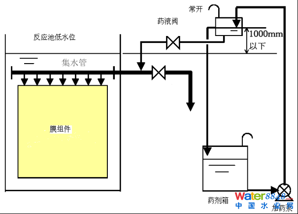 (b)請(qǐng)?jiān)?/span>膜元件處于浸沒(méi)狀態(tài)下進(jìn)行注入。為了確保操作者的安全,請(qǐng)確保水面到膜元件上部的水深在500mm以上。
