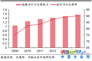 此次修訂稿的發(fā)布,也正式拉開了污水處理廠提標(biāo)改造的序幕。近年來,我國城鎮(zhèn)污水處理率不斷提升,截至2014 年底,城市污水處理率達(dá)到90.18%,污水處理廠集中處理率為85.94%。排放標(biāo)準(zhǔn)的大幅提高預(yù)計(jì)將開啟污水廠的升級(jí)改造, 有望在2016-2017 年釋放大量需求。