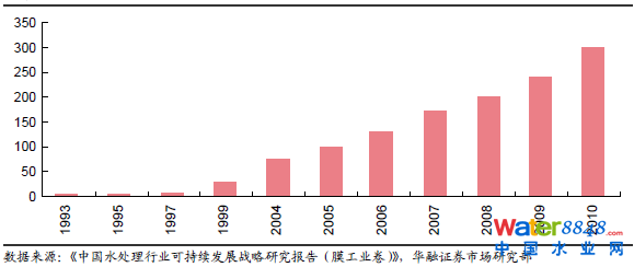 目前全球膜市場(chǎng)規(guī)模不斷增大,預(yù)計(jì)到2020 年,全球膜法水處理膜組器及工程市場(chǎng)規(guī)模將達(dá)到800 億美元。我國膜產(chǎn)業(yè)發(fā)展同樣迅速,已經(jīng)成為繼歐洲、北美后全球第三大水處理市場(chǎng)。2010 年,我國膜產(chǎn)值超過300 億元,占全球膜市場(chǎng)的10%左右。根據(jù)中國膜工業(yè)協(xié)會(huì)的《中國膜行業(yè)“十三五”戰(zhàn)略發(fā)展規(guī)劃》編制思路,“十三五”期間,膜產(chǎn)業(yè)將實(shí)現(xiàn)產(chǎn)值翻番,年均增長20%左右。“十三五” 末期功能膜產(chǎn)值突破2500 億元,出口實(shí)現(xiàn)100 億元/年。