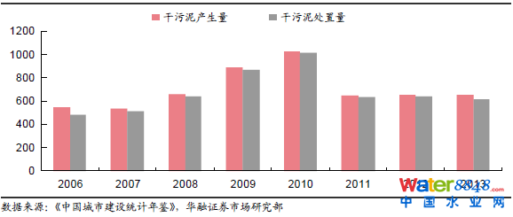 圖表9:全國城市污水處理廠干污泥產(chǎn)生量、處理量(萬噸/年)