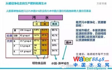 從被動凈化走向生產(chǎn)肥料和再生水,人的排泄物雖然只占污水的1%但含有污水中的大部分有機物和絕大部分營養(yǎng)鹽。既然污水要凈化,資源要回收:按城市模式,本是資源和能源的排泄物,百倍稀釋后需要以能量消滅能量,以資源降解資源。