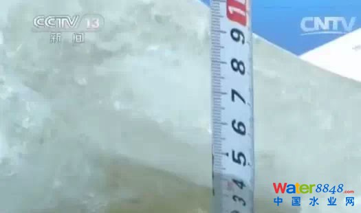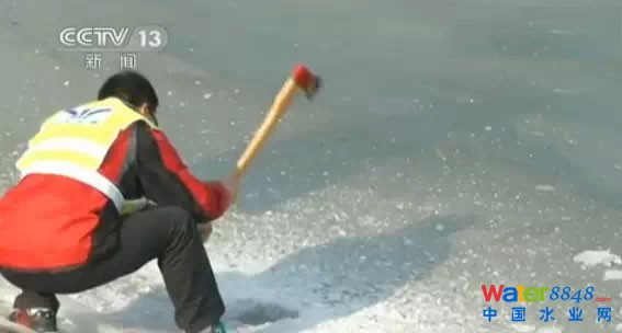 在干渠邊上,南水北調(diào)中線工程易縣段的工作人員,拿起專用工具在冰面上鑿了下去,但冰層很厚,鑿起來頗為吃力,三分鐘后,工作人員鑿出了一個(gè)長方形的冰洞。經(jīng)測量冰層厚度為9厘米,冰層下的水溫為零度。