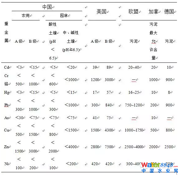 2006年,中國(guó)科學(xué)院地理科學(xué)與資源研究所從全國(guó)范圍內(nèi)選取了107個(gè)城市污水處理廠的污泥樣品,測(cè)定其重金屬含量。結(jié)果表明,中國(guó)城市污泥中As、Cd、Cr、Cu、Hg、Ni、Pb和Zn的含量,與2001年以前的調(diào)查結(jié)果相比總體上呈下降趨勢(shì),與我國(guó)《農(nóng)用污泥中污染物控制標(biāo)準(zhǔn)》相比,當(dāng)前我國(guó)城市污泥重金屬的超標(biāo)率很低,我國(guó)城市污泥中的重金屬污染風(fēng)險(xiǎn)并不高,絕大部分可以經(jīng)過無害化處理后進(jìn)行土地利用。表3是我國(guó)污泥土地利用重金屬的控制和其他幾個(gè)國(guó)家的對(duì)比,其中可以看出我國(guó)對(duì)施用污泥重金屬的控制還是相對(duì)嚴(yán)格的。