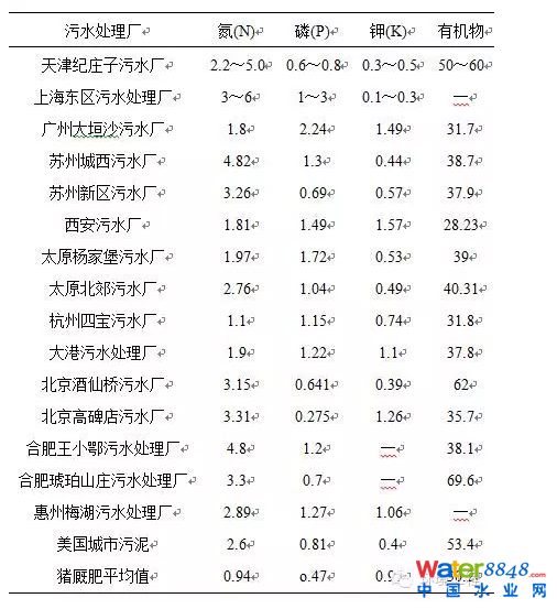 表2列出了我國(guó)部分城市的污泥的有機(jī)物和營(yíng)養(yǎng)物質(zhì)含量以及與美國(guó)和豬廄肥的對(duì)比,從表中可以得出污泥完全可以作為有機(jī)肥料來使用。