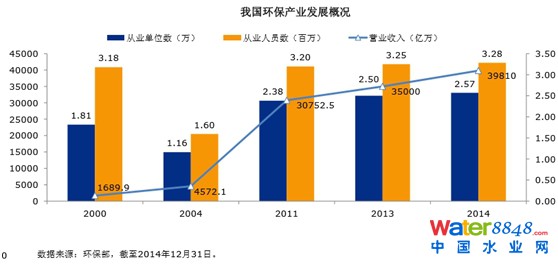 環(huán)保產(chǎn)業(yè)總體規(guī)模在一定程度上反映一國(guó)對(duì)環(huán)境保護(hù)的重視程度及環(huán)保產(chǎn)業(yè)發(fā)展趨勢(shì),在國(guó)家和各級(jí)政府不斷加大投入的背景下,近年來,我國(guó)環(huán)保產(chǎn)業(yè)穩(wěn)步發(fā)展。根據(jù)環(huán)保部等三部委的聯(lián)合調(diào)查,2014年,全國(guó)環(huán)保從業(yè)單位25,710個(gè),從業(yè)人員328萬人,年?duì)I業(yè)收入39,810億元,產(chǎn)業(yè)總體規(guī)模持續(xù)擴(kuò)大,預(yù)計(jì)環(huán)保產(chǎn)業(yè)將繼續(xù)保持15%-20%的發(fā)展速度。