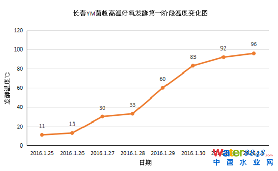 長春屬極度嚴(yán)寒地區(qū),冬季室外溫度長期處于-15℃~-25℃,車間內(nèi)溫度維持在0℃左右,YM菌與污泥混合后溫度在5℃,經(jīng)過第一階段發(fā)酵,最高溫度已上升至96℃,極有力地證明了YM菌適應(yīng)性強,發(fā)酵過程不受外界溫度影響等特點,且在發(fā)酵過程中無臭味產(chǎn)生,徹底解決傳統(tǒng)污泥好氧發(fā)酵過程中產(chǎn)生臭氣的困擾。