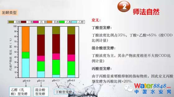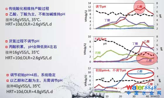 基于這個(gè)我們來看人的胃的消化系統(tǒng)是什么,到胃里是胃酸為主,通過混合反應(yīng)器最后完成了消化過程,根據(jù)這個(gè)特點(diǎn)來看,對(duì)雜食類動(dòng)物要考慮它的反應(yīng)條件,現(xiàn)在的反應(yīng)器是不是最合理的反應(yīng)器。我們也看一下兩項(xiàng)消化,水解酸化,如果控制PH,起碼在酸化項(xiàng)6左右,產(chǎn)生了主要的丁酸、丙酸、乙酸。如果我們不控制PH在一定的很短的停留下PH會(huì)下降,丁酸和乙酸的數(shù)量就會(huì)產(chǎn)生變化,特別重要的是在PH等于4以后乙醇就產(chǎn)生了,所以我們就控制在PH等于4的情況下,可以看乙醇這樣的主導(dǎo)產(chǎn)物。