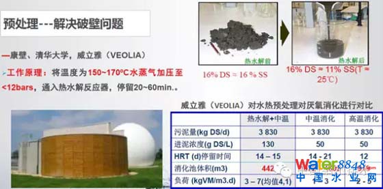 這三個(gè)方面有不同的技術(shù)路線。第一個(gè)破壁問題,有微波的等等預(yù)處理手段,但是現(xiàn)在大家好象都認(rèn)同熱水解,熱水解確實(shí)能使得破壁,同時(shí)使得不流動(dòng)的厭氧污泥變得流動(dòng)。以威立雅為例,以前的池容比較大,停留時(shí)間比較長(zhǎng),通過熱水解之后污泥濃度提高的本身使得池容消減,同時(shí)效率負(fù)荷也提高,但是它仍然采用的是厭氧消化池,在某些程度上緩解了這種問題。我們可以期待北京的污泥厭氧消化工程能夠有好的表現(xiàn),北京的污泥有機(jī)質(zhì)含量有時(shí)候是比較高的,可達(dá)60%以上。