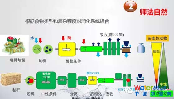 所以應(yīng)該說產(chǎn)酸發(fā)酵成為現(xiàn)在的厭氧消化非常重要的研究熱點(diǎn),有了這樣的想法我們?cè)趺磥韺?shí)行這個(gè)東西,就是"師法自然"。我們知道一些人、動(dòng)物對(duì)有機(jī)物降解的效率遠(yuǎn)遠(yuǎn)高于我們現(xiàn)在的反應(yīng)器,F(xiàn)在看方的是攪拌,綠的和黃的是酸堿的合流,條件的不同,實(shí)際簡(jiǎn)單說對(duì)食草性的動(dòng)物和對(duì)雜食性的動(dòng)物胃的消化系統(tǒng)是完全不同的,這是把胃的消化系統(tǒng)在生物角度上來進(jìn)行的一項(xiàng)分解。