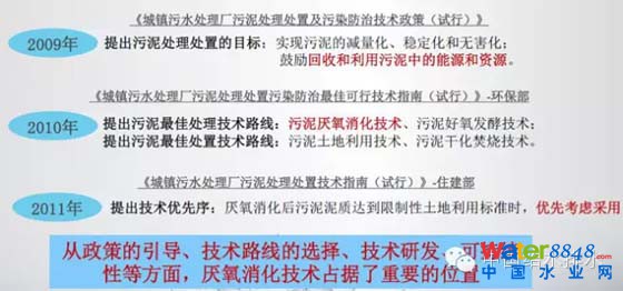 我國(guó)污泥處理處置現(xiàn)狀,這張片子主要講現(xiàn)在2015年3500噸也好,4000噸也好,到2020年達(dá)到6000噸也好,污泥的量是在不斷的增加,確實(shí)達(dá)到相當(dāng)?shù)臄?shù)量。國(guó)家的"水十條",建設(shè)部、發(fā)改委等相關(guān)文件都有相關(guān)的要求,技術(shù)路線以前都在講不是非常明確,實(shí)際上從現(xiàn)有的政策來講,資源化、能源化導(dǎo)向是非常明顯的,而且從政策的導(dǎo)向來看,從這幾年發(fā)布的國(guó)家級(jí)別的文件來看,厭氧消化占據(jù)了重要的位置。