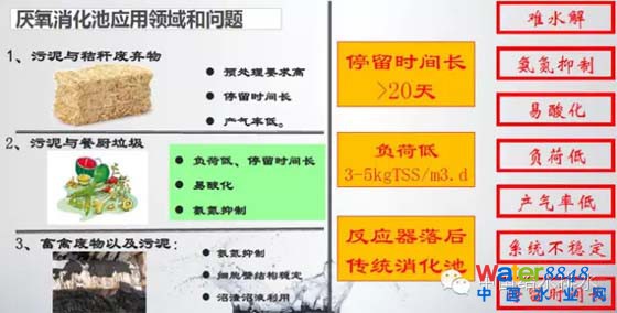 此外,厭氧消化池應(yīng)用領(lǐng)域和問題,像污泥與秸稈廢棄物,預(yù)處理要求高,停留時(shí)間長(zhǎng),產(chǎn)氣率低。污泥與餐廚垃圾,負(fù)荷低。還有就是畜禽廢物以及污泥。這里停留時(shí)間長(zhǎng),污泥大約20天,在德國(guó)都是大于40天的,今后要用在垃圾上可能停留時(shí)間更長(zhǎng)。