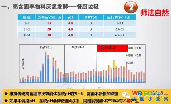 我們兩種方式進(jìn)行了培養(yǎng),一種最傳統(tǒng)的國(guó)際工藝方式,一種好氧顆粒污泥的方式。產(chǎn)氧污泥跟酸化合起來以后,我們酸化負(fù)荷達(dá)到20公斤,而后續(xù)處理的負(fù)荷也是能夠達(dá)到23公斤,從整體上來看,一個(gè)產(chǎn)酸的反應(yīng)器加一個(gè)甲烷的反應(yīng)器的話,整體的負(fù)荷達(dá)到平均20公斤左右,整個(gè)的停留時(shí)間達(dá)到了不到4天,而上一個(gè)圖可以看出水非常好,出水總的COD是500毫克升。這是用餐廚垃圾做的一個(gè)結(jié)果(PPT)。