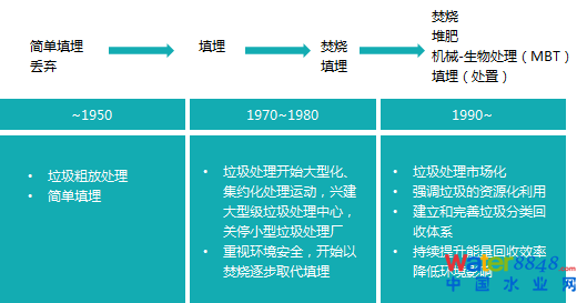 概括而言,在治理思路上,發(fā)達國家所走過的路有這樣幾個大的趨勢:逐步取代/淘汰填埋;集中化、大型化處理;提高資源化利用率;市場化(第三方處理)等。