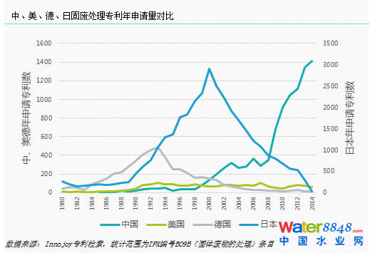 2008年后,由于社會對環(huán)保問題的關(guān)注和基礎(chǔ)設(shè)施投資建設(shè)潮的到來,我國固廢處理行業(yè)邁入一個新的階段(值得一提的是,在環(huán)保產(chǎn)業(yè)的諸多領(lǐng)域,2008都是較為特殊的一年,許多指標(biāo)都有突出的增長,這與奧運帶來的環(huán)保話題效應(yīng)以及隨之而來的治污舉措不無關(guān)系)。工業(yè)危廢、電子廢棄物、餐廚垃圾等更加專業(yè)化和細(xì)分化的市場領(lǐng)域開始啟動,快速增長的市場容量催生出了東江環(huán)保等技術(shù)色彩更濃的上市公司。固廢處理領(lǐng)域的技術(shù)創(chuàng)新迎來了第二次爆發(fā)。目前,我國的年專利申請量已超過美、德、日等一眾發(fā)達國家,全球固廢領(lǐng)域技術(shù)創(chuàng)新最為活躍的國家。目前中國每年新申請的固廢處理相關(guān)專利在1500個左右,這一數(shù)字依然在不斷增長。