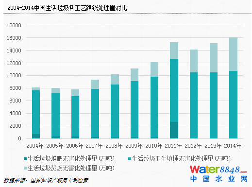 90年代末,垃圾填埋的對環(huán)境的威脅及占地問題開始得到重視,規(guī)范化和逐步取代填埋的政策導(dǎo)向開始確立。2000年起,《城市生活垃圾處理及污染防治技術(shù)政策》、《可再生能源發(fā)電價格和費用分?jǐn)傇囆修k法》、《生活垃圾焚燒污染控制標(biāo)準(zhǔn)》等一系列法律、規(guī)劃、和標(biāo)準(zhǔn)逐步奠定了垃圾焚燒工藝路線發(fā)展的政策環(huán)境,填埋所占的垃圾處理量比率開始不斷降低,而以焚燒為主的其它工藝的處理量比率不斷升高。由于焚燒的技術(shù)含量更高以及核心設(shè)備(焚燒爐等)的國產(chǎn)化需求,我國的第一個固廢處理技術(shù)創(chuàng)新高峰也在這一時期到來。與此同時,垃圾處理市場化進程也在逐步往前走,如桑德環(huán)境(合加資源)、三峰環(huán)境、綠色動力環(huán)保等現(xiàn)今已成為行業(yè)龍頭的幾家固廢處理(垃圾焚燒)企業(yè)也在此階段完成關(guān)鍵性的資源積累,開始在業(yè)務(wù)上快速橫向擴張(跑馬圈地)。