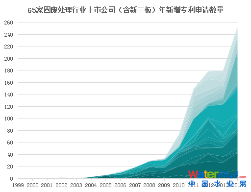 但另一方面,從固廢處理企業(yè)的研發(fā)投入及專利申請增長量情況來看,企業(yè)主體正在向扛起技術(shù)創(chuàng)新大旗的目標(biāo)努力。下圖是對包括新三板企業(yè)在內(nèi)的65家固廢處理上市公司年專利申請量的統(tǒng)計,可以發(fā)現(xiàn),企業(yè)的年專利申請量呈現(xiàn)跨越式增長。可以說,市場化的企業(yè)主體在固廢處理領(lǐng)域的技術(shù)創(chuàng)新方面擁有愈加重要的地位。