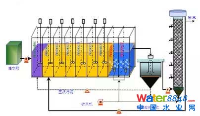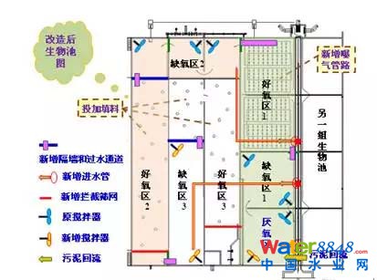 傳統(tǒng)A2/O工藝存在的問題:(1)硝化不完全;(2)冬季溫度較低時(shí),出水NH4+-N很難控制在5mg/L以下;(3)反硝化不完全;(4)TN去除率較低,平均值僅為27%;(5)除磷效果較差;(6)出水總磷偏高,平均值為1.9mg/L;(7)進(jìn)水中有機(jī)碳源沒有充分利用;(8)大量DO進(jìn)入缺氧池,破壞了缺氧環(huán)境,脫氮效率較低。(9)攪拌效果不佳,攪拌機(jī)功率偏小,缺氧區(qū)有明顯的泥水分離界面;(10)好氧池和缺氧池的隔墻過水通道斷面太大,存在返混現(xiàn)象。