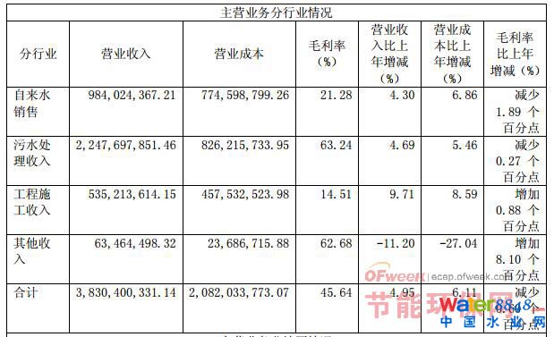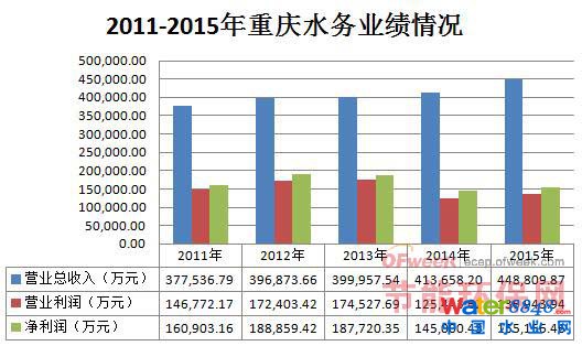 重慶水務(wù)2015年實現(xiàn)營業(yè)收入448,809.87萬元,比2014年413,658.20萬元增加35,151.67萬元,同比增長8.50%,實現(xiàn)歸屬于上市公司股東的凈利潤136,943.94萬元,同比上升7.0%,每股收益達(dá)到0.32元,較2014年增長6.67%;其中,主營業(yè)務(wù)收入383,040.03萬元,比去年同期增加4.95%;其他業(yè)務(wù)收入65,769.84萬元,比去年同期增加35.07%,主要系公司所屬自來水企業(yè)新增二次供水安裝業(yè)務(wù)較多所致。