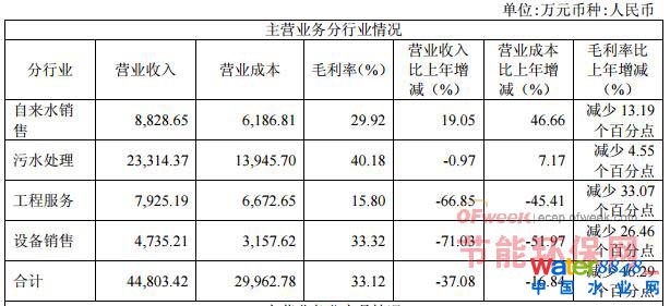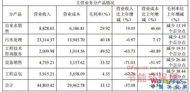 分產(chǎn)品來看,總共下降16.29%,其中自來水銷售下降13.19%,污水處理下降4.55%,工程技術(shù)咨詢服務(wù)下降33.07%,設(shè)備銷售下降26.46%,工程總包下降38.44%。