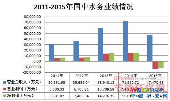 國中水務(wù)2015年度實現(xiàn)營業(yè)收入47,470.48萬元,同比下降34.06%;實現(xiàn)歸屬于上市公司股東的凈利潤-11,787.43萬元,同比下降178.49%。