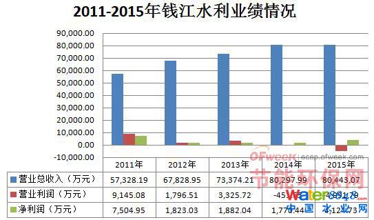 錢江水利自2000年涉足水務(wù)行業(yè),目前擁有城市供水和污水處理規(guī)模179萬噸/日。2015年公司實現(xiàn)營業(yè)收入80,443.07萬元、比上年同期增0.18%,其中水供給及處理行業(yè)的營業(yè)收入73,602.97萬元,比上年同期增長3.32%,實現(xiàn)穩(wěn)步增長。實現(xiàn)合并歸屬于母公司所有者凈利潤4,124.73萬元,同比增長132.98%,利潤增長主要來自于公司投資、理財收益的增長和參股公司天堂硅谷盈利的大幅增長。