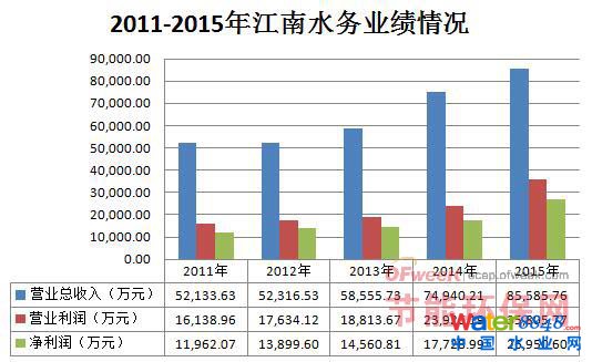 江南水務(wù)的收入來源比較簡單,主要是包括自來水業(yè)和工程安裝,兩項業(yè)務(wù)都比2014年有所增長,特別是工程安裝方面提升較快。