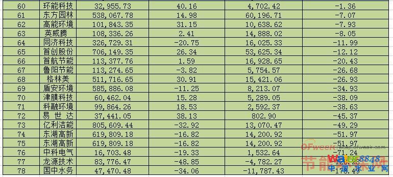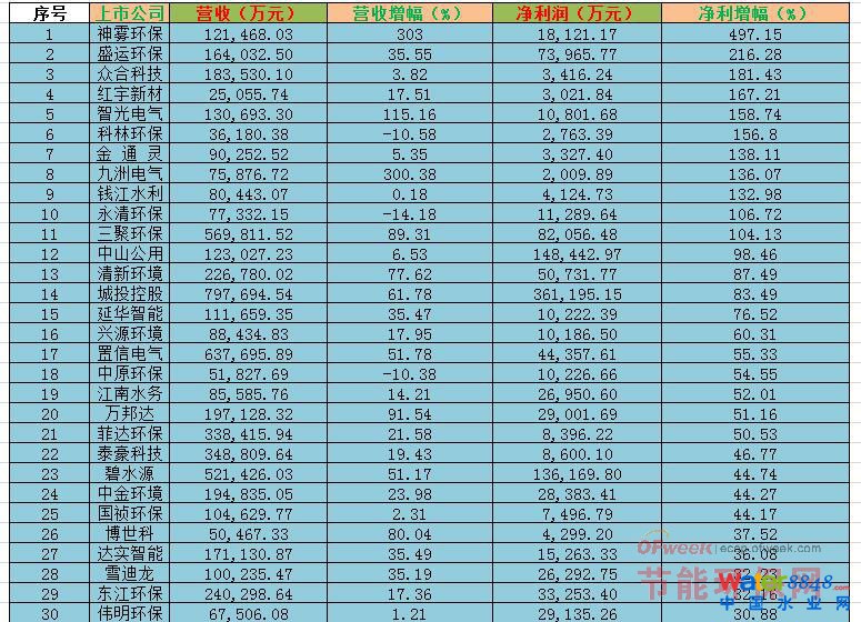 以大氣處理、凈化除塵、脫硫脫硝為主業(yè)的節(jié)能環(huán)保上市公司共有13家,其業(yè)績(jī)對(duì)比情況如下: