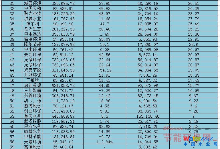 以供水、自來水、水處理、污水處理等為主業(yè)的節(jié)能環(huán)保上市公司共有29家,其業(yè)績(jī)對(duì)比情況如下: