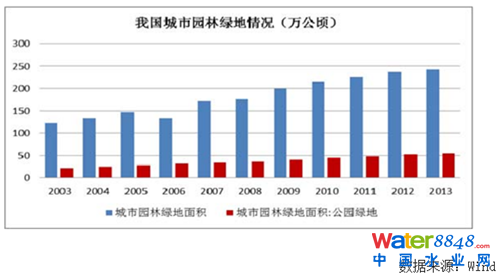 隨著城市建成區(qū)面積的不斷擴大和公共環(huán)境的持續(xù)改善帶動了市政園林單位投資額的逐年提升,大型公共綠地建設投資由 2003 年的 321.9 億元增加到2013 年的 1,647.4 億元, 年復合增速17.74%。 主要城市人均公園綠地面積從 2003年的 6.49 平方米增長到 2013 年的 12.64 平方米,年復合增速 6.89%。近年來,我國城市園林綠地面積和公園綠地面積分別由2003 年的121.17 萬公頃和21.95萬公頃增長至 2013 年的 242.72 萬公頃和 54.74 萬公頃,年均提高 12.15 萬公頃和 3.28 萬公頃。