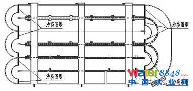 根據(jù)氧化溝面積大、分槽的特點(diǎn),在溝內(nèi)適當(dāng)?shù)奈恢迷O(shè)置砂袋圍堰,分區(qū)、分段清理淤泥,先直線段后圓弧段,先兩側(cè)后中間,先清理完的區(qū)段可提前進(jìn)入池壁沖洗、涂刷DPS涂料工序,以加快施工進(jìn)度,縮短氧化溝停產(chǎn)時(shí)間。流水作業(yè)流程:分段、分區(qū)清理污泥→沖洗池壁→涂刷DPS防腐涂料→下一段施工。砂袋圍堰采用梯形斷面,頂寬0.5m、底寬0.8m、高0.6m,砂袋圍堰布置見(jiàn)圖6。