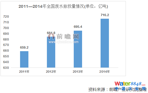 2011年,我國(guó)廢水排放總量659.2億噸,2012年為684.8億噸,2013年為695.4億噸,2014年為716.2億噸,呈現(xiàn)逐年上升的趨勢(shì)。隨著水資源日漸匱乏、水污染問(wèn)題嚴(yán)重、廢水大量排出,發(fā)展污水處理迫在眉睫。