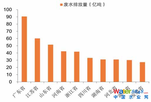 隨著我國(guó)經(jīng)濟(jì)快速發(fā)展,我國(guó)污水排放量也持續(xù)增加,2014年,我國(guó)污水排放總量達(dá)716.2億噸,同比增長(zhǎng)2.99%。其中,工業(yè)廢水排放量205.3億噸,城鎮(zhèn)生活污水排放量510.3億噸。2014年,我國(guó)污水排放量前十省份分別為廣東省、江蘇省、山東省、河南省、浙江省、四川省、湖南省、河北省、湖北省、安徽省,共排放廢水438.7億噸,占全國(guó)廢水排放量的61.25%。