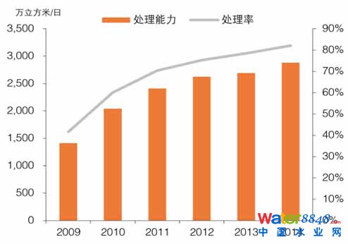 據(jù)住建部統(tǒng)計(jì),2014年年末,全國(guó)城市共有污水處理廠1808座,比上年增加72座,污水廠日處理能力13088萬(wàn)立方米,比上年增長(zhǎng)5.1%,城市年污水處理總量401.7億立方米,城市污水處理率90.18%。2014年年末,全國(guó)縣城共有污水處理廠1554座,比上年增加50座,污水廠日處理能力達(dá)到2881萬(wàn)立方米,比上年增長(zhǎng)7.1%,縣城全年污水處理總量74.3億立方米,污水處理率為82.11%。總體來(lái)說(shuō)城鎮(zhèn)污水處理已經(jīng)達(dá)到相當(dāng)高的水平。