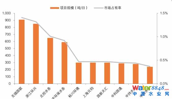 我國(guó)污泥處理行業(yè)市場(chǎng)集中度較低,專(zhuān)業(yè)仍事污泥處理處置的企業(yè)較少,且規(guī)模較小,未出現(xiàn)龍失企業(yè)。根據(jù)E20環(huán)境平臺(tái)的統(tǒng)計(jì)結(jié)果,截至2015年10月,各企業(yè)已運(yùn)營(yíng)的BOT、BOO、DBO、投資運(yùn)營(yíng)類(lèi)項(xiàng)目處理規(guī)模,在調(diào)查企業(yè)中,無(wú)錫國(guó)聯(lián)、浙江環(huán)興和北控水務(wù)分別以1.41%、1.32%和1.01%的市場(chǎng)占有率位居榜單前3名。