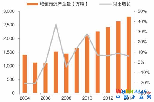 根據(jù)環(huán)保部的統(tǒng)計(jì),2014年我國(guó)城鎮(zhèn)污泥產(chǎn)生量為2801.47萬(wàn)噸,同比增長(zhǎng)11.57%,2008—2014年均增長(zhǎng)11.57%。長(zhǎng)期以來(lái),我國(guó)污水處理廠普遍存在“重水輕泥”的現(xiàn)象,使得我國(guó)污水處理快速發(fā)展,污泥處理停滯不前,污泥處理處置缺口巨大。截至2014年底,全國(guó)污水處理廠產(chǎn)生的污泥無(wú)害化處置率僅為56%,主要處置方式為衛(wèi)生填埋、焚燒、制肥、制造建材。余下的污泥中,約三分之一采用“臨時(shí)手段”處置,剩余污泥去向不明。