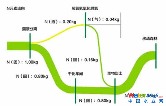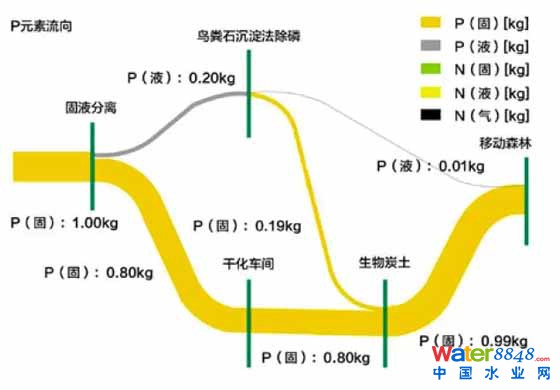 根據(jù)魚梁洲項目的設(shè)計,原污泥中80%的氮進入沼渣,隨后轉(zhuǎn)化為生物炭土;而進入沼液的氮經(jīng)過厭氧氨氧化法和鳥糞石沉淀法后有20%形成氮氣排入大氣,剩余的氮通過鳥糞石沉淀(磷酸銨鎂,分子式MgNH4PO4-6H2O)也進入生物炭土。與氮的遷移類似,原污泥中80%的磷會進入沼渣;而進入沼液的磷經(jīng)過鳥糞石沉淀法之后有95%形成鳥糞石沉淀進入生物炭土中;剩余的磷進入最終的沼液中被用于苗木的滴灌或排入污水處理廠中。